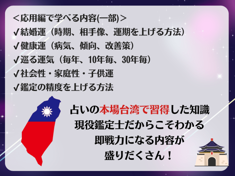 基礎編に続き応用編を受講しました。行運の概念や健康・結婚運の読み解きが加わり、鑑定の精度と深みが格段に向上したように思います。