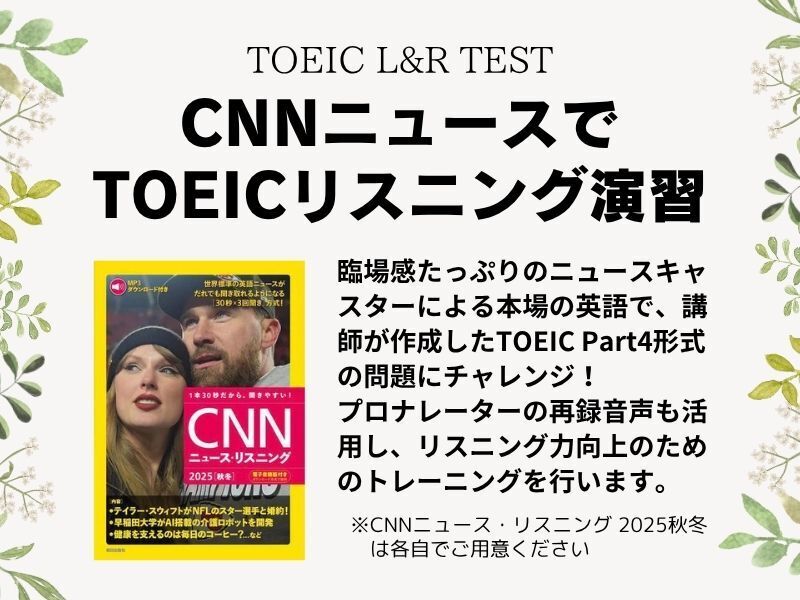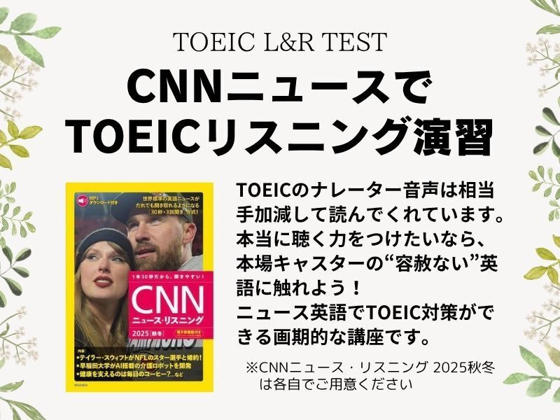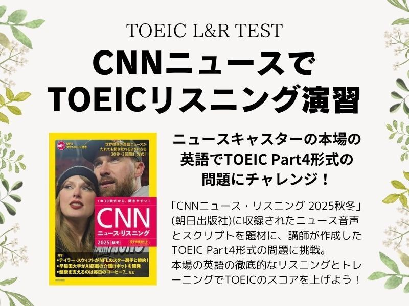 CNNニュース・リスニング 2025[秋冬](朝日出版社)を用いてTOEIC対策を行う、画期的なリスニング講座です。