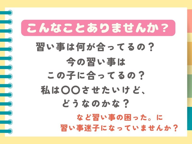 子どもがまだ小さくて、習い事はまた早いかなと思っていたけど、子どもの向き不向きや実際にやりたいことが見つかったときにどうしてあげたら子どもにとってベストなのかを知ることができました!