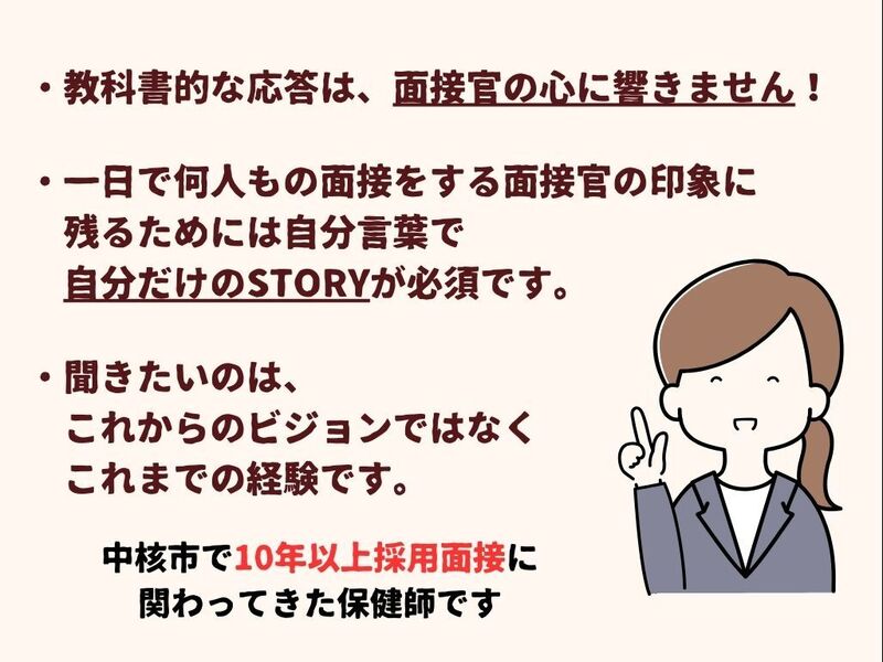 さあ、行政保健師として働こう!採用試験の面接対策は、自分の言葉で、自分の思いを経験を伝えることが重要です。その伝え方、本当に伝わっていますか