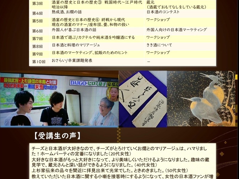 はじめて受講してみたのですが、お酒の知識と経験と愛がいっぱいの先生とお酒大好きな受講生たちとの和気あいあいの非常に楽しい講座でした。出して頂ける肴も美味しくてお酒の話も弾みます。お酒の情報がいっぱい入りますし楽しくてあっという間に講座時間が終わってしまいました!