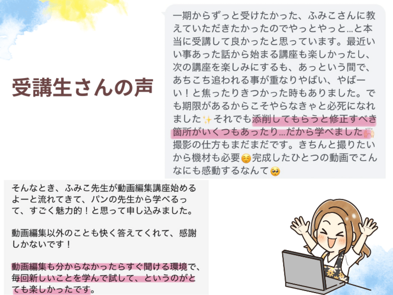 動画編集講座を受講して、本当に感謝の気持ちでいっぱいです。これまで「動画編集は難しい」と思い込んでいましたが、その気持ちを優しく打ち消していただきました。やるたびに少しずつスピードも上がり、「やってみよう!」と前向きに取り組めるようになったのは先生のおかげです。