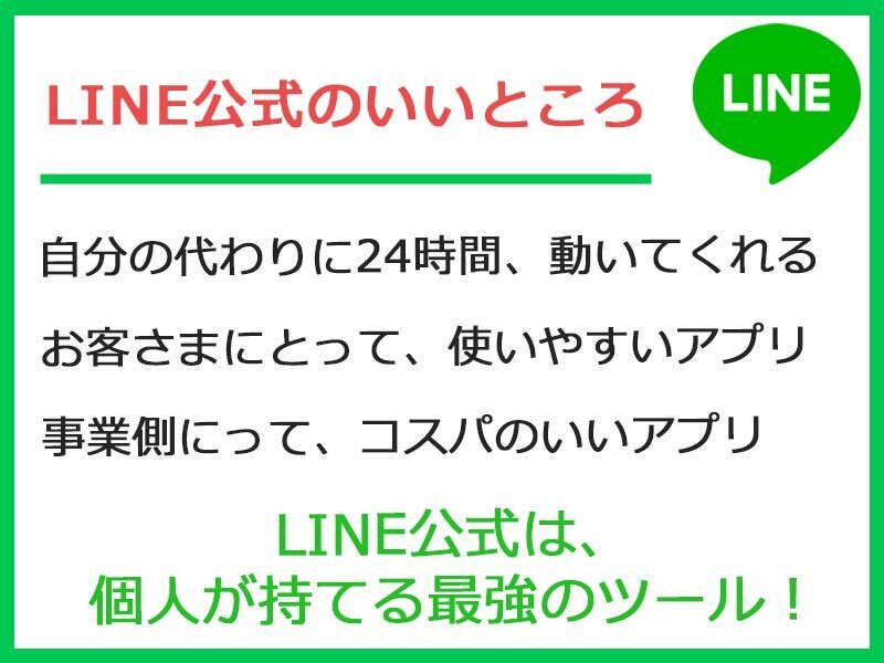 ・LINE公式アカウント(公式LINE)は、個人用のLINEではありません。ビジネス用のLINEですのでお間違いなく。