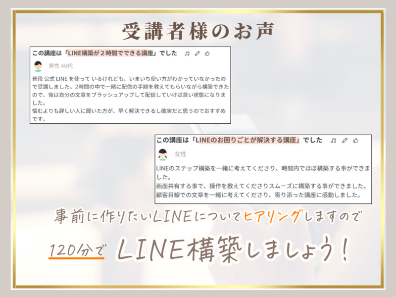■普段 公式 LINE を使って いるけれども、いまいち使い方がわかっていなかったので受講しました。2時間の中で一緒に配信の手順を教えてもらいながら構築できたので、後は自分の文章をブラッシュアップして配信していけば良い状態になりました。