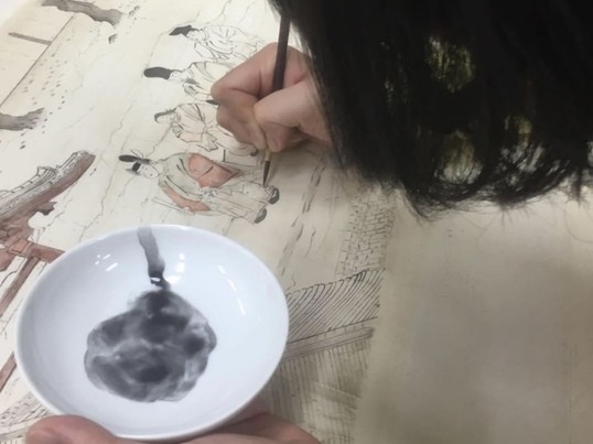 輪郭線の内側を塗る鉤勒法(こうろくほう)を使用。高価な岩絵具も自由に使え、面倒な膠も準備万端!