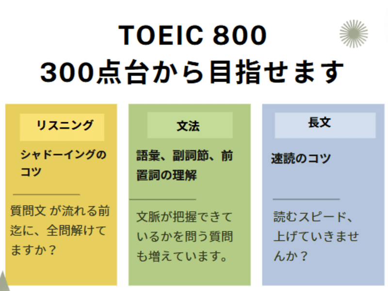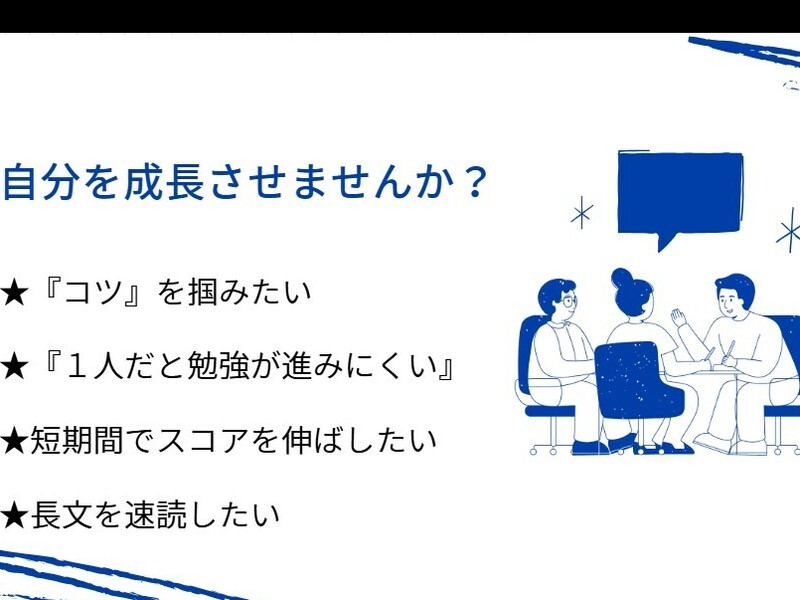 目標スコアに対する勉強方法や勉強を継続するうえでの取り組み方をご教示頂けました。また問題を何問か解いたあとのフィードバックが適格で、間違えやすい問題の傾向を把握できました。本番でのテクニックも豊富に教えて頂きましたので、まずはできそうなところから取り入れて見ようと思います。自分では気づけなかった長所も引き出して貰え、やる気に繋がりました。ありがとうございました。