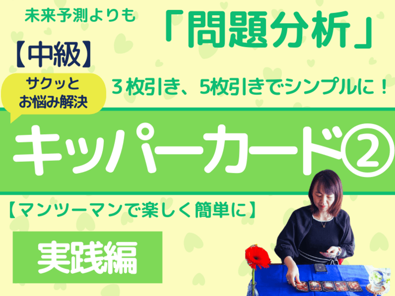 3枚引き、5枚引きのスプレッドを教えてもらい、実践的にリーディングをしていきました。カードの意味の一覧表をいただき、それを見ながらたくさんリーディングできたので、ものすごく勉強になりました。また先生がものすごく褒め上手でリーディングに自信が持てるようになります♪ありがとうございました。