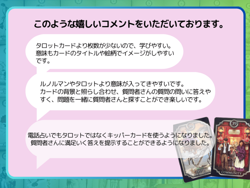 講座を通じて、キッパーカードの深さを実感しました。何度もお付き合いいただき実践練習をさせていただき、具体的なフィードバックをもらえたことで、自分の理解が深まりました。