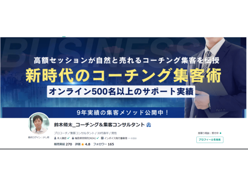 コーチングで人生を好転させる専門家コーチング/集客コンサルタントの鈴木脩太です。【実績】430名のオンラインサロンの運営「ココナラ」プラチナランク獲得ココナラの「コーチング」カテゴリでおすすめ順&ランキング1位獲得