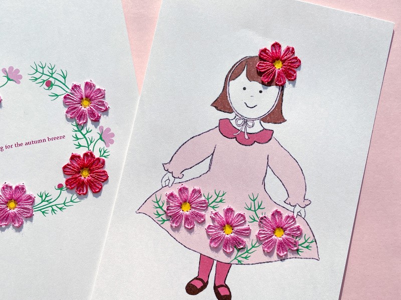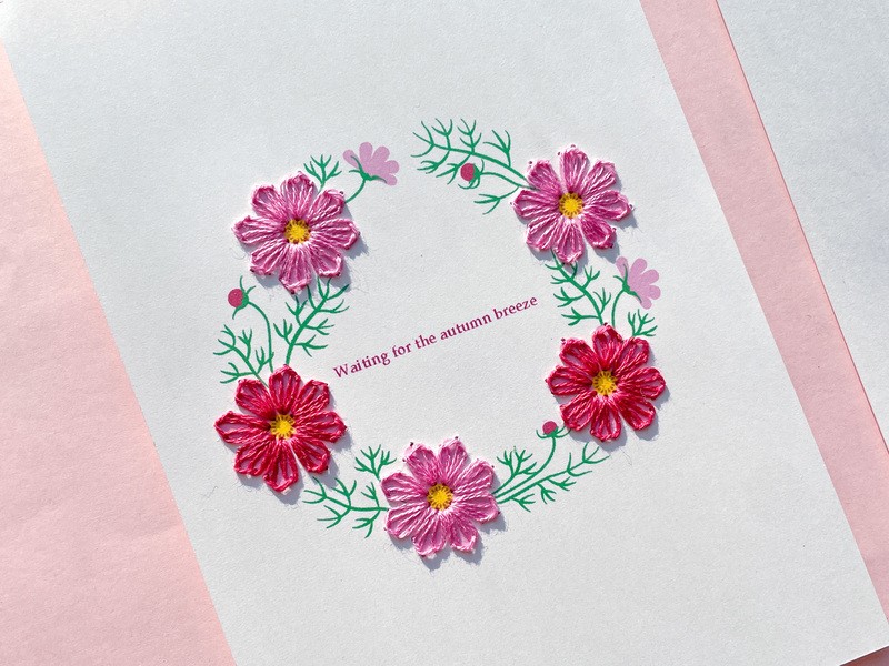秋風にそよぐコスモスの花をイラストの上から刺繍します🌸