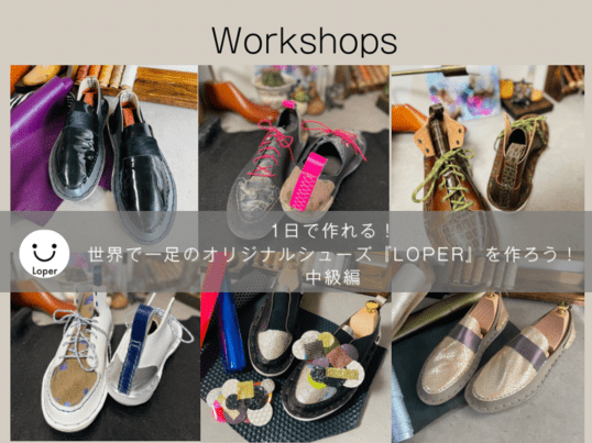 東京 自由が丘にアトリエを構え、大阪のプロダクトデザインのブランドproefが展開するLoperというレザークラフトとスニーカーが融合したハンドメイド靴の認定クリエイター資格を持ち、靴や各種レザーアイテムのワークショップやオーダーメイドでオンリーワンのお仕立てを行っております。