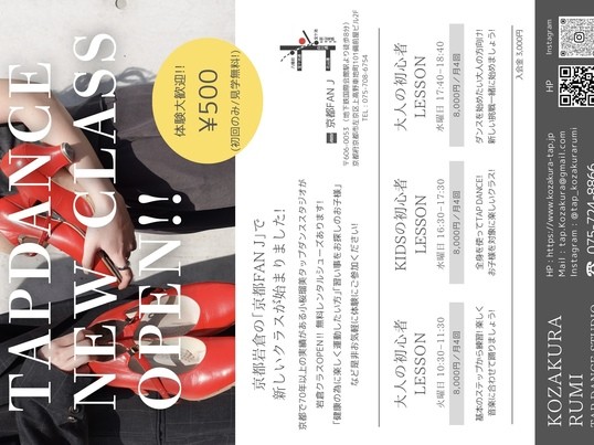 京都下鴨で70年以上の実績のある小桜瑠美タップダンススタジオが岩倉クラスOPEN!「健康の為に楽しく運動したい方」「習い事をお探しのお子様」など是非お気軽に体験にご参加ください!皆様タップを習いにきてくださる方は初心者の方ばかり!レンタルシューズあるので安心してください✨