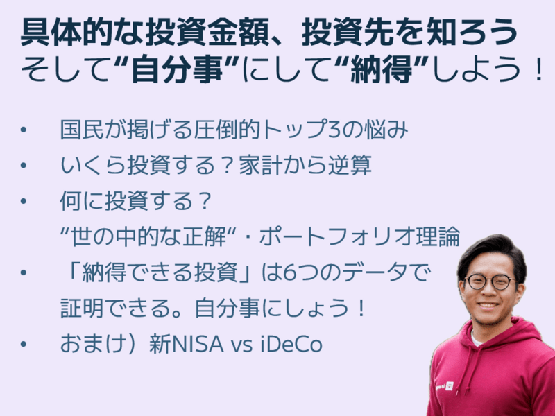 まとめると、「具体的な投資金額、投資先を知れる」講義になっています。資産運用を実践に移すには超大事!なコンテンツとなっています。