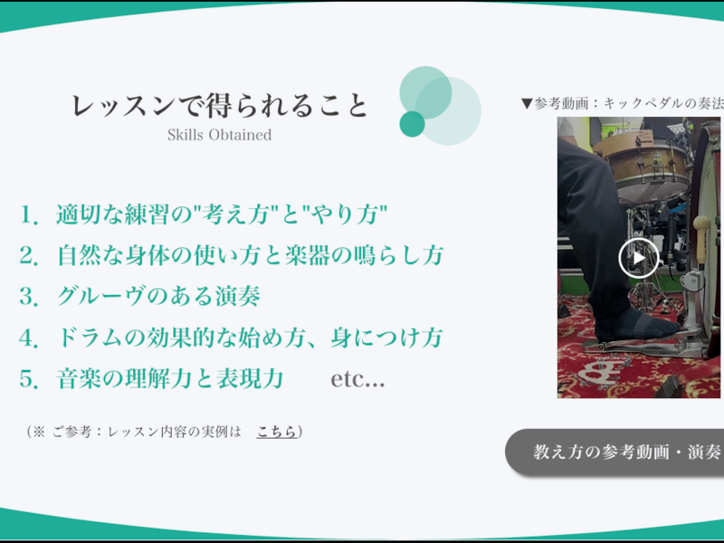 └自分に合った課題を頂けるところ、各楽器の音の出し方等、丁寧なご指導です!ツインドラムに関しては、先生と同じリズムを叩いたりできますし、目の前でお手本が見せてもらえるところです。習い続けていると、趣味とはいえドラムのモチベーションが保てます。