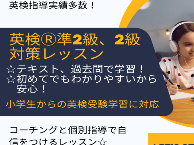 小学生からの英検合格実績多数の講師が英検Ⓡ準2、2級の指導を楽しく行います! 個別指導とコーチングで安心して受講できます。