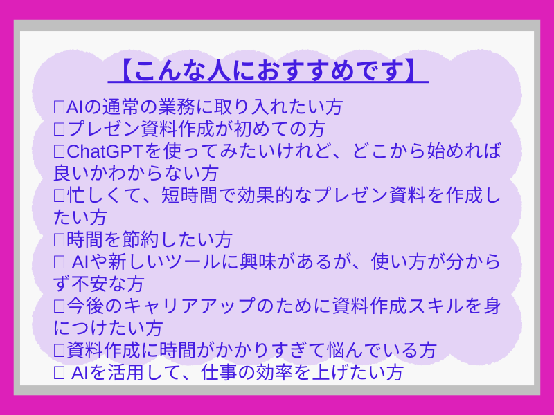 プレゼン資料の作り方を分かりやすく教えて頂きました。早速仕事に使わせて頂きます