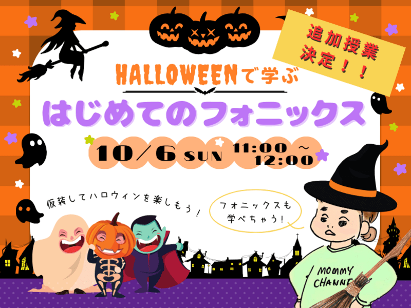 好きな仮装を先生に一人づつ認めてもらったり、ハロウィンの英単語を皆で発音してみたりと楽しく進めながらも、しっかりフォニックスの歌も教えて下さり、とても充実した授業でした!