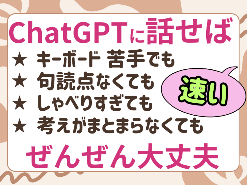 実はchatGPTの講座は2つ程受けたことがあったのですが、どちらもchatGPTの本講座やサブスクへのセールスの色合いが濃く、chatGPTが如何にスゴイか、chatGPTを使って如何に稼げるかを一方的にレクチャーされる内容でがっかりでした。それでも懲りずに今回は、「かんたん、らくらく、音声入力」というキャッチフレーズに惹かれて申し込みましたが申し込んで本当に良かったです。一緒に画面共有をしながら、実際の登録から操作方法までを自然な流れの中で教えていただき、どんどん楽しくなってしまいました。chatGPTと仲良くなって行く方法を理論的にも実践的にも教えていただけたことや、私の興味に合わせた内容をチョイスしていただけたことが大きかったと思います。それどころか、chatGPTを日常の中で活用するイメージも広がり、それに対するアドバイスまでいただけました。ここまでしていただいちゃって良いのか?こちらが心配になる位に寄り添っていただきありがとうございました。明るいキャラクターも魅力的な方でしたので是非お友達にも勧めさせていただきます。