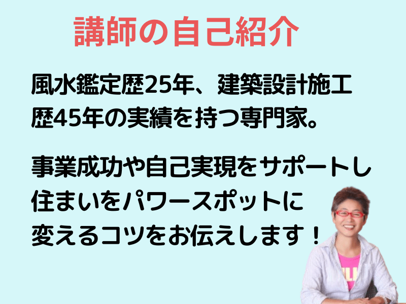 1999年「風水環境科学」を学ぶきっかけとなったのは師匠の松永修岳氏と出会いです。「環境が人の心や健康をつくり、その人の幸不幸や精神性まで深く関係している」ことを知り、カルチャーショックを受けたことが、風水を学ぶきっかけとなりました。両親が離婚して寂しい子供時代を送ってきた私の一番の願いは、目の前にいる小さな子供が安心して笑顔で暮らせる家、夫婦仲良く、親子...