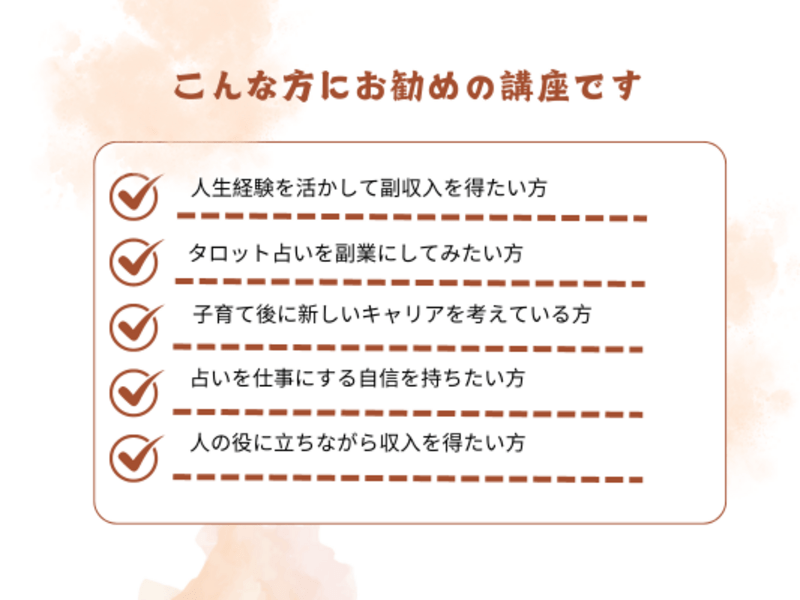 私は、タロット占いとカウンセリングを融合させたアプローチを通じて、シングルマザーや副収入を得たい女性をサポートしています。私自身かつては経済的な不安や将来への悩みを抱えていましたが、タロットとカウンセリングを学び、自信を取り戻し、副収入を得るスキルを身につけました。現在では、多くの受講生にタロットを副業スキルとして伝え、成長をサポートしています。