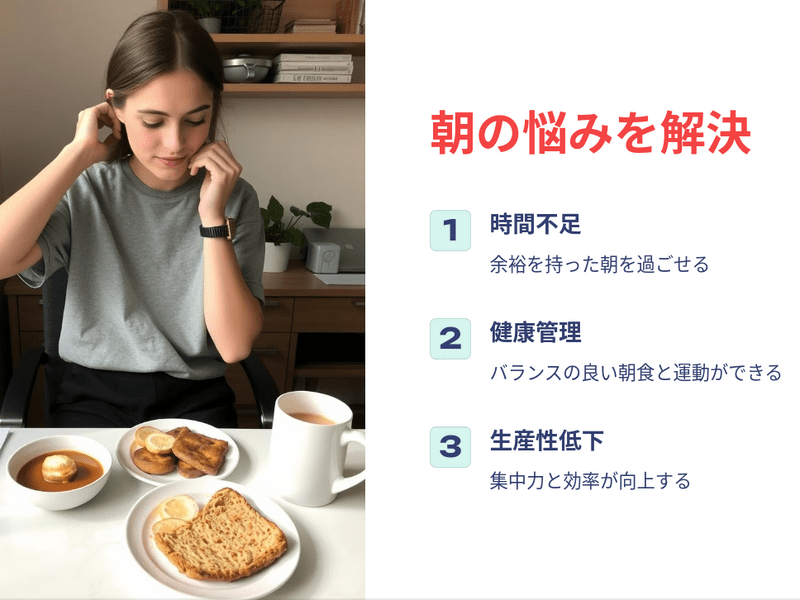 • 朝食をしっかり摂る時間ができ、栄養バランスが改善されます