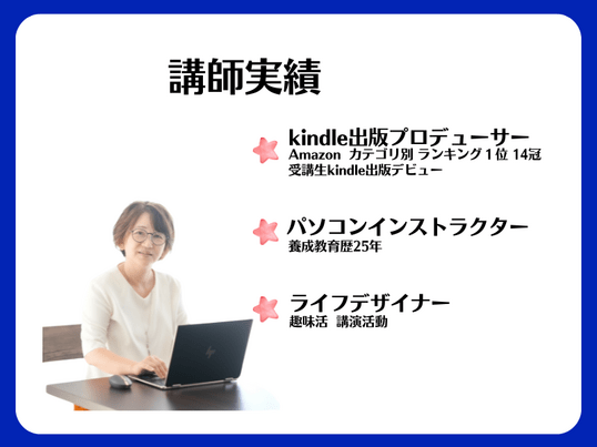 電子書籍の作り方はもちろん、「パソコン操作のつまずきやお悩み事」まで丸ごとサポートできる点が、私の一番の強みです。