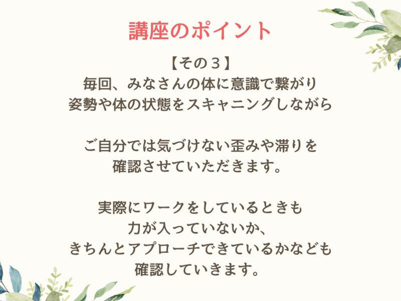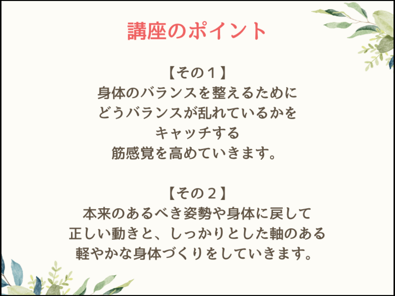 講座では、感情や体を解放する術を習得して、自分軸を太くすることでありのままの自分を好きになり、軽やかに生きるための身体づくりをお伝えしています。