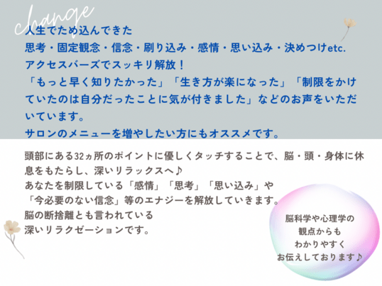 私は、アクセスバーズに出会い講座を受講後、9年間の不眠から抜け出したことをきっかけにセッションの提供をスタート。
