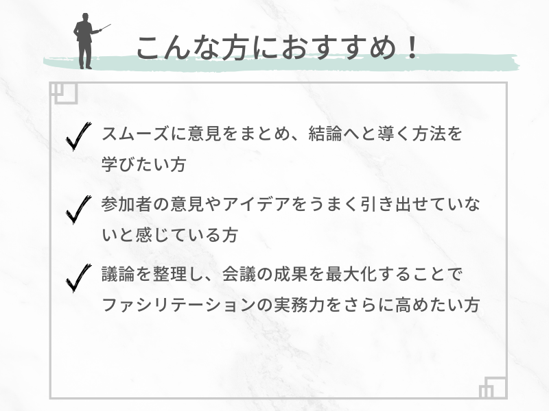 特に、複雑な議論を整理し会議の成果を最大化することで意見がまとまりにくい状況を上手にリードしたい方、ファシリテーションの実践力をさらに高めたい方におすすめです。