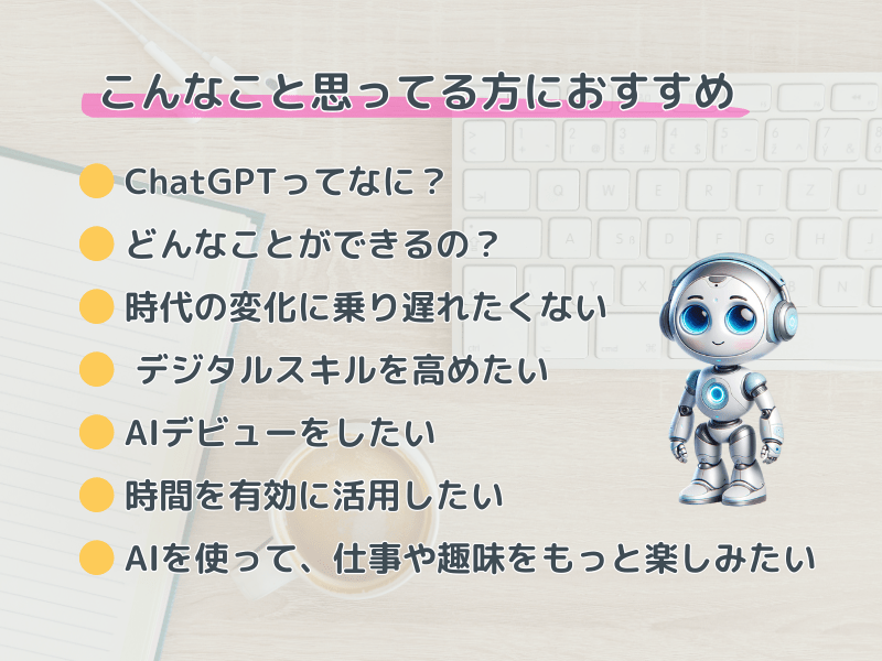 先日はありがとうございました。ChatGPTを使うきっかけとして素晴らしい講座でした。忘れないうちに早速活用したいと思います。機会があれば知り合いにも受講を勧めます。