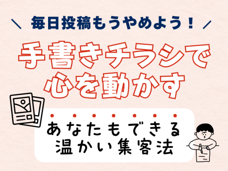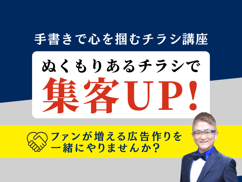 この経験を活かし、過去の自分と同じように悩み苦しむ経営者を支えたいという想いから、「手書きチラシ講座...