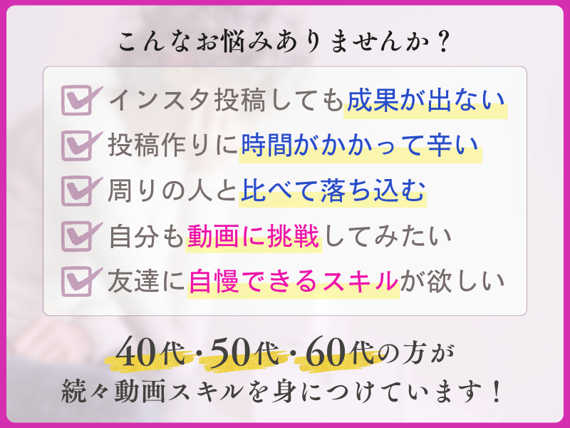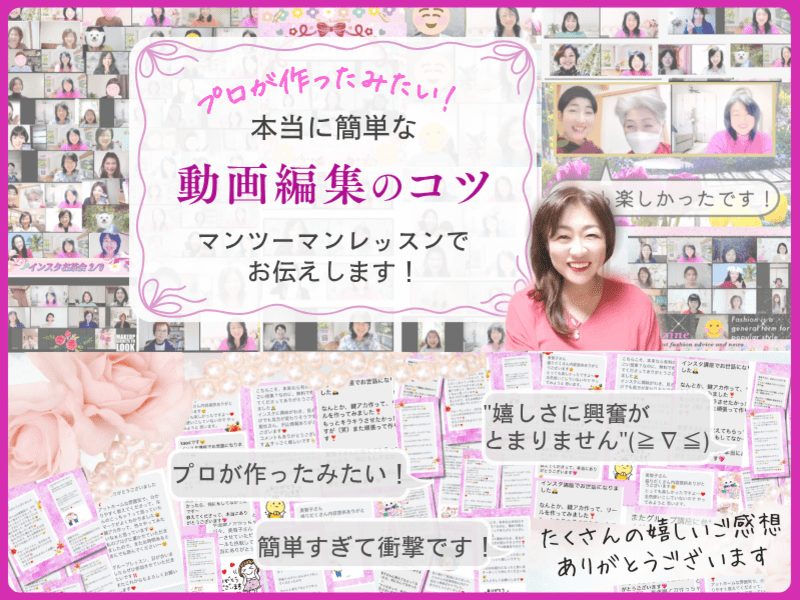 紹介したいサービスがあり、動画を作ってみたくても腰が重く、なかなか1本仕上げることが出来ませんでした。アプリを開いては閉じて、また別のアプリを開いては閉じてと、動画作成アプリをはしごしていましたが全くものにならず、そんな状態で本当に1時間の講座の中で動画が作れるのだろうかと半信半疑の中、受けてみたところあれよあれよと3本完成してしまいました!これには本当に自分でもびっくりしました。先生のアドバイスのおかげで、何も難しくなく簡単に出来ました。そしてとても楽しかったです!動画作りが楽しくなりました!ありがとうございました!