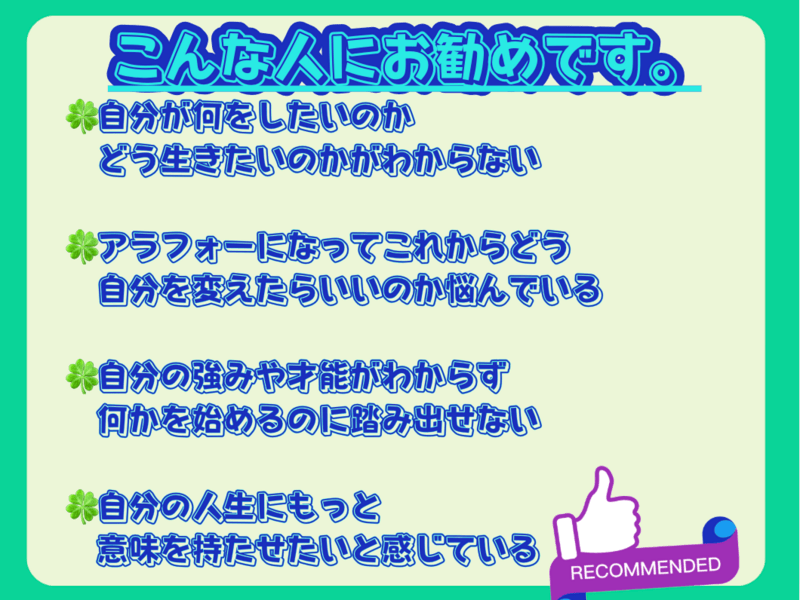 40代になり何だかモヤモヤした気持ちを持っていましたが先生が親身になってヒヤリングしてくださり自分の気持ちが整理できました。また四柱推命で自分の適材適所を知る事ができ仕事でも活かせる方法を教えてくださいました。講座終了後、スッキリしました。
