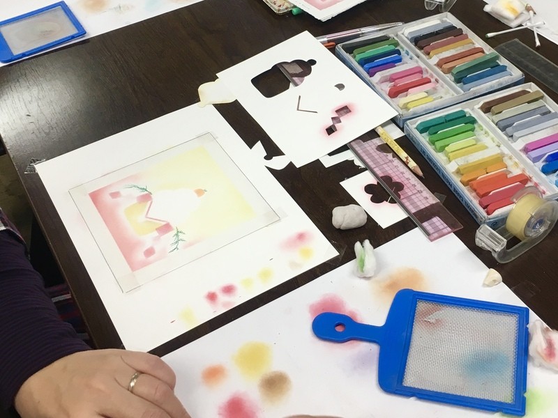 講師があらかじめ用意した型紙と、48色のパステルを使って、ステンシルのように絵を描いていきます。
