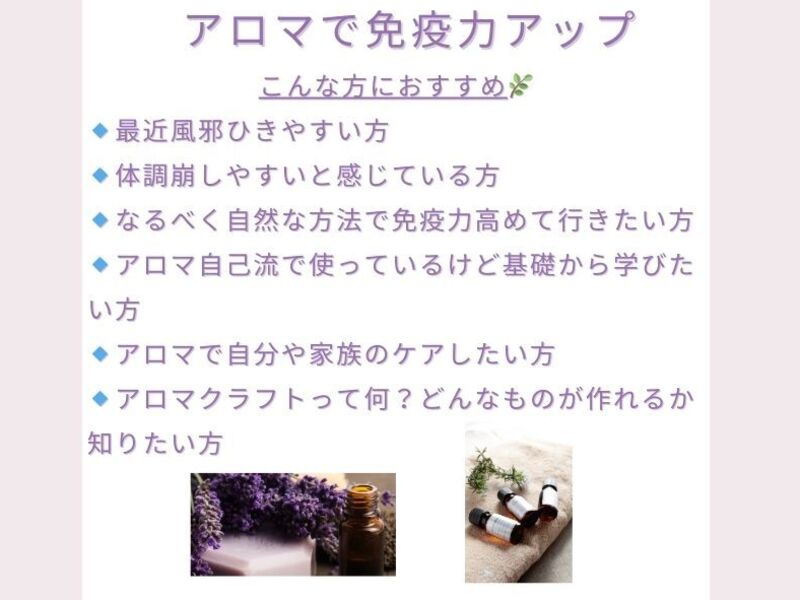 免疫力アップには生活習慣も大切で、その上で自然の力のアロマを使って予防できることを教えていただき、良かったです。