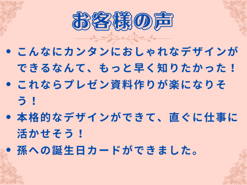 今回私は他の講座でお世話になったあと、リピーターでこの講座でお世話になりました。facebookも最近さわっていなかったのと、Canvaはほとんど触ったこともなく自信がなかったのですが 本当に初めてだった私にも基本からわかるように教えていただけました
