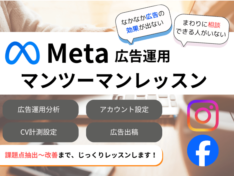 自分で行ったメタ広告の設定に不安があったので相談させていただきました。先生の知識は豊富で分かりやすく教えてくださったので、成果が出ない理由が明らかになってとても勉強になりました。