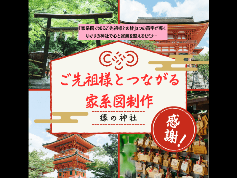 家系図を作ると、自分のルーツに関わる“8つの苗字”が浮かび上がります。これらの苗字を辿ることで、ご先祖様にゆかりのある神社を見つけ出し、感謝や祈りを捧げる場を得ることができます。