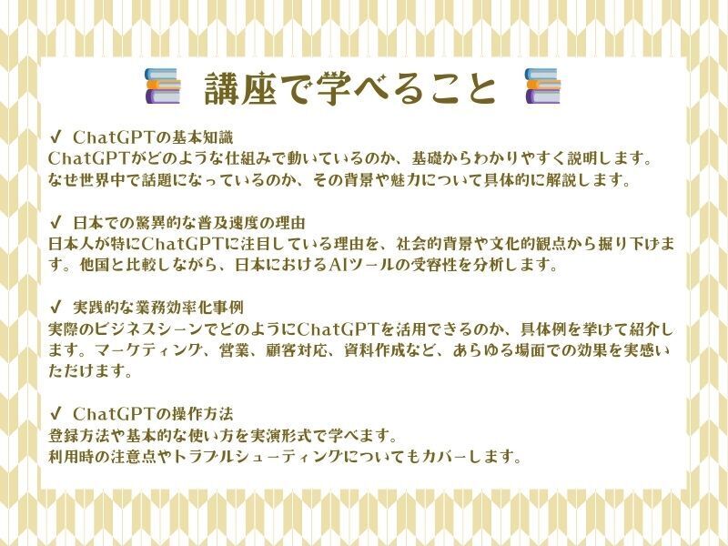 講座終了後には、「何ができるのか」ではなく「どう活用するか」という視点でChatGPTを使いこなせるようになります。