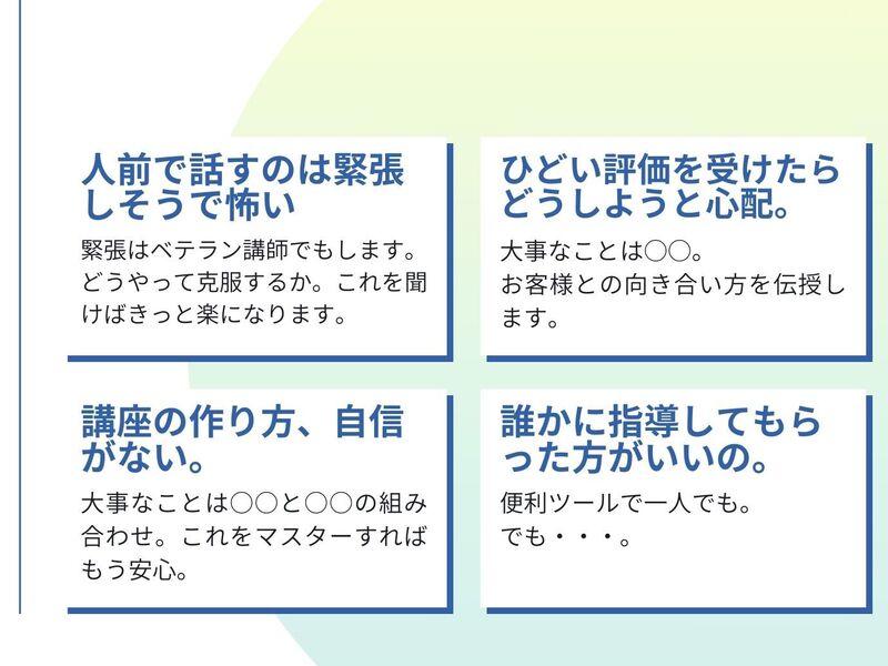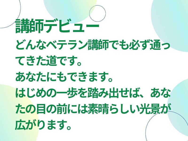 講師業のノウハウを知る上で必要だと思い、講座を聞かせて頂きましたが、何故、講師業に関心があるのか?目標だけではなく目的を明確にし、挫折しない、ブレない自分として、お話を聞きながらも、自分自身に問いかけるお話でした。終始、笑顔で話しかけて頂きましたが、私自身の目標設定の甘さをしっかり、わかり易くご指摘頂き、とても大切な時間を過ごさせて頂きました。感謝です。次回も面談して頂きたいと思います。有難うございます。