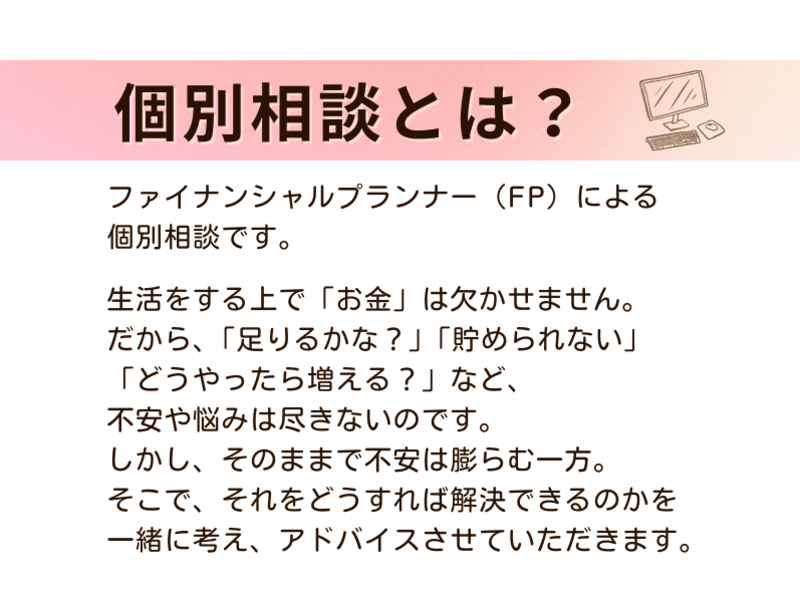 独身女性の老後や将来のお金の不安を一緒に軽減していく個別相談です。