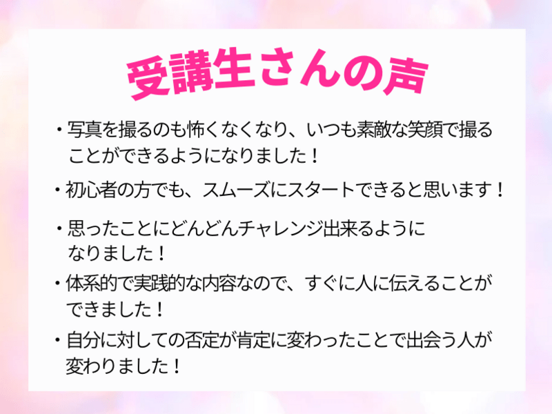 自然な笑顔になれるポイントも教えて頂き、毎日やるモチベーションも持てました。