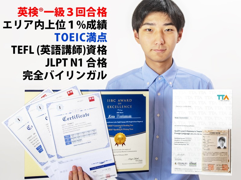 【こんなことが得意です】★英検の作文や面接指導★留学・移住のお手伝い(願書作成、各種翻訳、書類チェック)★ネイティブナレーション(訛りの無いきれいな発音です)★英語シッター(お子さまと仲良くなることが得意です)★海外勢とのオンラインゲーム補助(同行可)★自然な英会話レッスン★ESL/EFL教材を使用したネイティブ指導※TEFL Level 5 Diplom... +続きを読む
