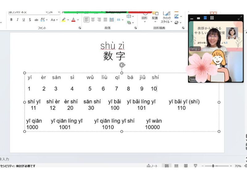学習内容やスケジュールは柔軟に対応いただけると思います。私の場合、あまり手広く学習するのではなく拼音通りの発音ができるように学習教材と授業をしていただきました。