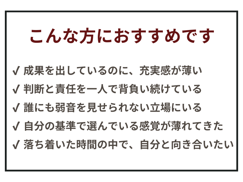 自分のことが後回しになっている方や、自分の軸を見つけたい方にぜひおすすめしたい講座です。