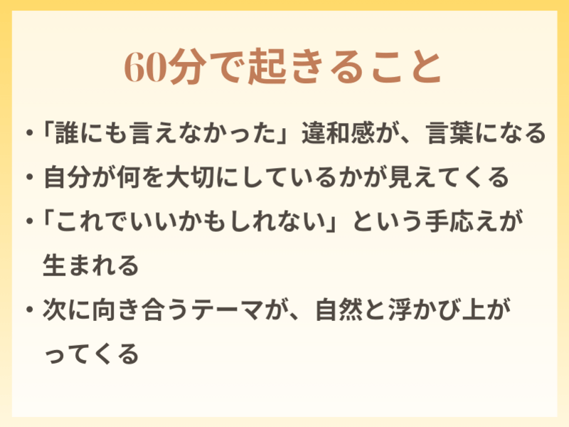 講座では自分の価値観や大切にしたいこととじっくり向き合う時間を持つことができ、気持ちが整理され、心が軽くなりました。