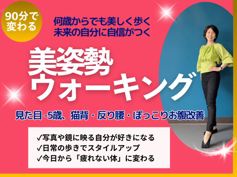 反り腰・猫背・巻き肩を直し、更年期の腰痛・膝痛をケア。ぽっこりお腹も凹む「一生モノの歩き方」を90分で習得。初心者OK【対面/東京・埼玉】