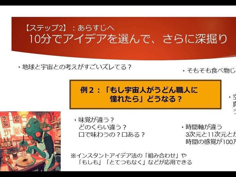 アイデアからあらすじにする過程に関しても、具体例をたくさん出してくださり、