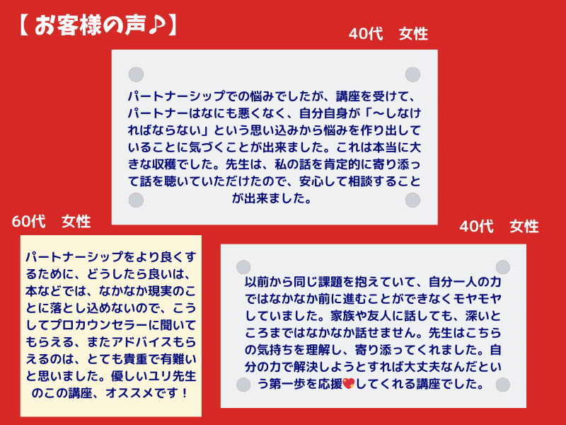 パートナーシップをより良くするために、どうしたら良いかは、本などでは、なかなか現実のことに落とし込めないので、こうしてプロカウンセラーに聞いてもらえる、またアドバイスもらえるのは、とても貴重で有難いと思いました。優しいユリ先生のこの講座、オススメです!