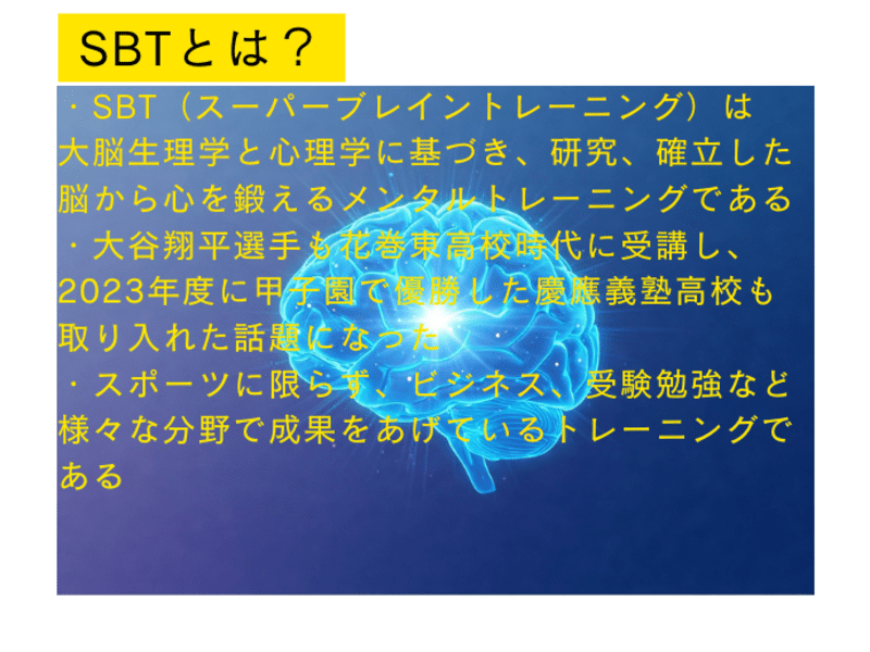 私は長年プロのバスケットボール選手として活動し、その後指導者として選手の成長をサポートしてきました。 SBTに出会ったとき、「もし現役時代に知っていたら、もっと成長できたかもしれない」と強く感じ、このメンタルトレーニングを多くの人に伝えたいと思うようになりました。 SBT(スーパーブレイントレーニング)は、脳の仕組みを活かして能力を引き出し、成功へと導くトレーニングです。高校時代の大谷翔平選手も学んだことで知られ、スポーツはもちろん、ビジネスや子育て、受験勉強など、あらゆる分野で役立ちま...